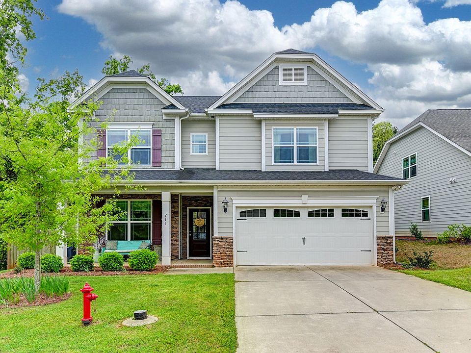 This fantastic home offers an ideal blend of comfort, convenience, and style. Located in the highly sought-after Lexington One school district, residents here enjoy quick access to the serene Lake Murray Dam park and boat ramp, perfect for outdoor enthusiasts. Additionally, shopping and dining options in Lexington are just a short drive away, ensuring you're never far from entertainment and necessities. Situated in the Dunhill community, zoned for Lexington One schools. This like-new home boasts an excellent condition and a fabulous layout. Step through the front door to discover light-filled formal living and dining rooms featuring wainscoting and beautiful hardwood floors throughout the main level. The kitchen is a chef's dream, equipped with granite countertops, a large island with bar stool seating, natural gas counter cooktop, stainless steel appliances, and ample storage space. The open kitchen design allows for seamless interaction with the great room, perfect for entertaining guests or keeping an eye on loved ones. A main level bedroom with his and hers closets shares a nearby full bathroom, while a mudroom off the two-car garage provides built-in organization for backpacks and shoes. A huge loft area on the second level serves as a versatile space, ideal for a playroom or additional entertainment area. Four second-level bedrooms, including a spacious master suite with tray ceiling, feature large closets for ample storage. The master suite includes a spa-like bathroom with a dual vanity, garden tub, walk-in shower, and a huge walk-in closet. Enjoy year-round outdoor living on the covered patio overlooking the fully fenced backyard, complete with a ceiling fan for hot summers. Schedule your private viewing today to experience the charm and convenience of this exceptional home firsthand! Don't miss out on the opportunity to make 216 Lightsey Ct. your new home sweet home. Contact us now to schedule your exclusive tour!