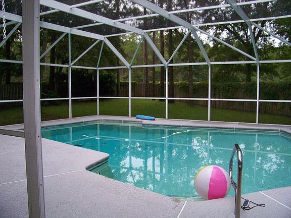 This 4 bedroom 2 bath home is located in a Community Association subdivision. In-ground salt pool with lanai. House features laminate and tile floors, fireplace with stone surround, vaulted ceiling in living room. Backyard has 6' privacy fence. 10 x 12 out-building.