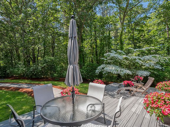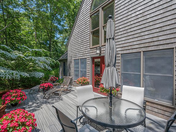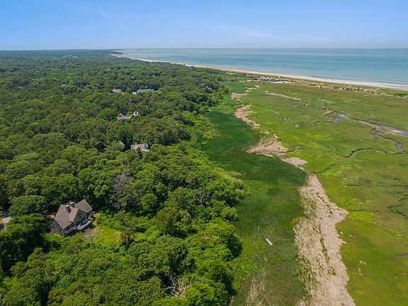 Want to get away from it all and escape to your own little haven? Don't miss this one of a kind property off of Route 6A set privately on just under 3 acres amid over 20 acres of conservation land. An S-shaped driveway at the end of Mitchell Lane leads you to this large contemporary home that scans the marsh and water views of the ever-changing Cape Cod Bay. A curved walkway leads to an open deck that spreads across the entrance to this 4 bedroom, 2 1/2 bath gem. Once inside, the brick fireplace is the centerpiece of the dining room and living room of red oak floors. The wide deck out the back offers panoramic water views while it swings across from the master bedroom along the living room to the den, each with slider access. The 20+ foot ceiling is breathtaking as the brick fireplace soars to the loft/home office above. On the lower level is a guest suite with two bedrooms, a full bath and a family room with a brick fireplace wall and sliders out to the back, Lots of storage space in the unfinished area of the lower level. The Cape Cod bike trial is just down the road. Don't miss this opportunity to make this unique home with it's picturesque location your own sanctuary.