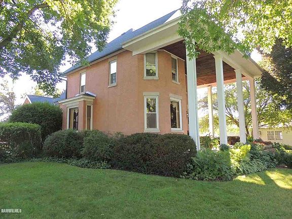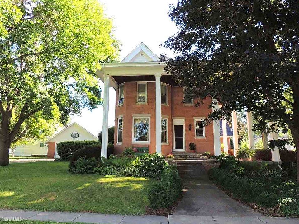 Enjoy small town living in the heart of Hanover with this sprawling historic brick on a beautifully manicured lot with several mature trees, a park across the street, and location offering a convenient drive to Galena and Chestnut Mountain Ski Resort. Front portion of the home houses a large living room that feeds to a formal dining space, open entryway with beautiful newel post and stairs leads to three bedrooms, a full bath, and an additional tandem room that would be great for an office/study/library/etc. Rear addition gives you a great deal of open space, featuring an expansive family room with vaulted ceilings, beamed accents, brick fireplace, and bar area. Updated kitchen with custom stained glass panels on some cabinets allows for functional workspace, and has eat-in area within. Part of basement offers space for additional family room/game room and has additional brick wood burning fireplace. Dramatic covered front porch offers neighborhood views and treed privacy, and concrete patio off of family room offers additional space to relax or entertain. Two car detached garage and concrete driveway. Unique property with a lot of space to enjoy!