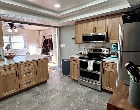 The Contemporary and Completely Remodeled Kitchen is a Chef's delight, featuring Corian Countertops, Tile Flooring, Stainless Steel Appliances, and ample cabinet space. Kitchen opens to a large Dining Room which is perfect for entertaining. You will love the Finished Lower Level with Lots of space for Family and Friends. Family Room, Rec Room, Home Gym are only a few of the possibilities. Laundry Room has New Epoxy Flooring and Washer and Dryer that will convey with home.