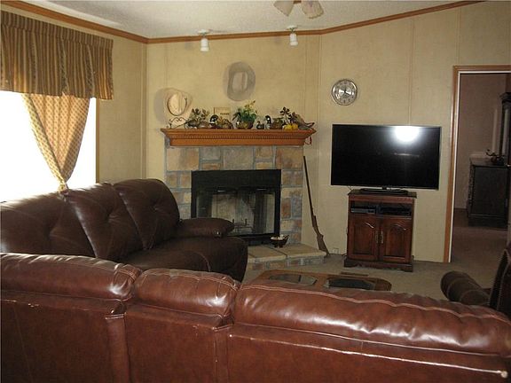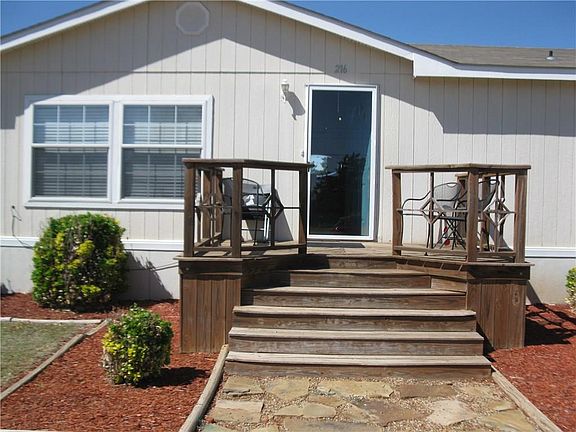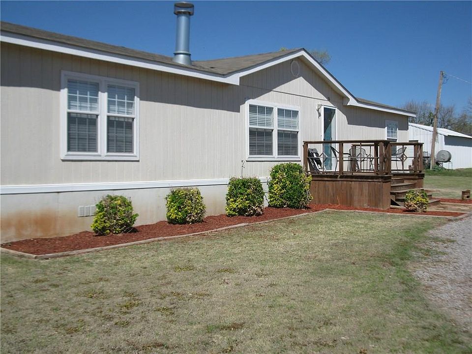 This 26 x 60 Manufactured Home with PEX piping and 2x6 wall studs is located within easy commuting distance for working in the Clinton/Weatherford areas. Combined utility payments of city water, city sewer, and city sanitation are quite reasonable, usually less than $50. monthly, and the monthly electric bill for this all-electric Home is $120-175. per the owner's records. The window treatments remain with the house. Reserved items include the patio and yard furniture as well as the clothes washer and dryer. The living room and the kitchen are in the center of the Manufactured home with the Master bedroom and Master bathroom to the South end and the 2 spare bedrooms with their bathroom on the North end. The patio and deck areas have lighted string for visual effects.