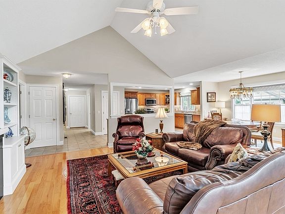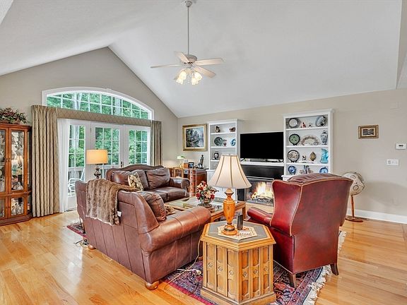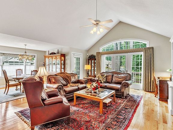 Welcoming end unit at The Elms features inviting interiors, tall ceilings, hardwoods & functional floorplan. Front entry welcomes & leads to front bedroom/den through double doors w/large walk-in closet & full bath w/tile flooring & linen closet. Renovated kitchen('21) showcases Kraftmaid cabinetry, tile flooring, pantry closet, stainless appliances, granite tops & breakfast bar overlooking both dining room & impressive great room w/vaulted ceiling, electric fireplace w/flanking bookcases, Pella French doors w/half-moon transom accessing wood deck. Adjacent Alumascape porch('22) is perfect spot for both morning coffee and/or relaxation overlooking well landscaped private grounds. Generous 1st floor primary suite offers walk-in closet & 3/4 bath. Dedicated laundry room w/wall cabinetry completes main level. Upper-level features ensuite bedroom w/hardwoods, two sets of double closets & third full bath. Two car attached garage & unfinished lower level provide great storage & convenience.