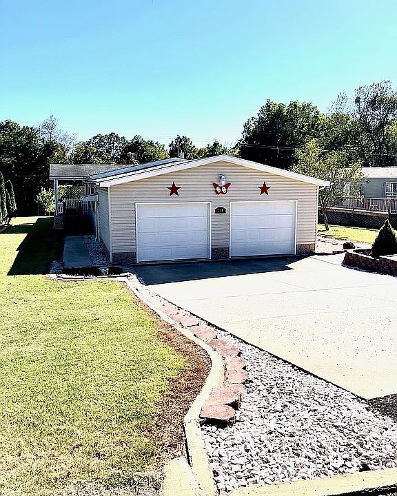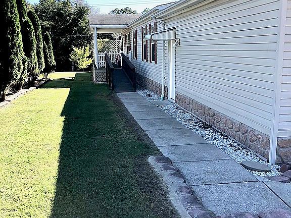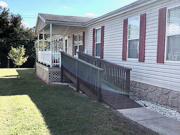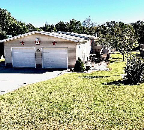 Welcome home! Beautiful custom double wide home in Rolling Meadows Mobile Home Community features large, bright sunroom, covered front deck, ramps at all entrances. Upgrades include new roof, fully sheetrocked interior, bullnose corners, crown molding, updated master bath, walk in shower, extra-large walk in closet, ample cabinet and storage space, 2 car garage with concrete driveway, landscaping with mature trees including 2 peach trees and storage shed. Home has been lovingly maintained and is drop-bag ready! Low lot rental rate. Purchase requires buyer to be approved by Rolling Meadows.
