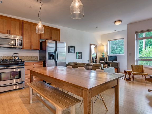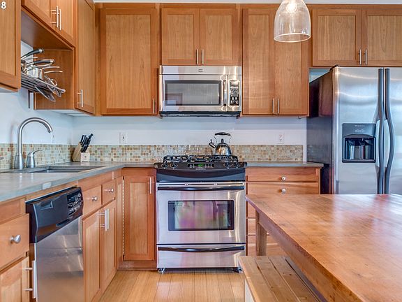 Rare chance to buy in the heart of the rapidly transforming Central Eastside. Architect-designed modern 1BD +office home is a surprisingly quiet, light-filled refuge on the top-floor of a small building. Open plan w/ high ceilings & oversized windows that provide seasonal city views. Wrap-around balcony w/ spacious/private covered sitting area. Bamboo floors, gas range, central air. Walk/Bike/Bus to work in the neighborhood or downtown