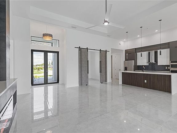 BRAND NEW waterfront home in highly sought-after SW Cape Coral. This 3-bedroom, 2-bathroom + office home features a 3-car garage with ALL ASSESSMENTS PAID. The property boasts upscale landscaping with palm trees, an elegant entry, and is NOT IN A FLOOD ZONE. Inside, enjoy high ceilings, porcelain tile flooring throughout, and stunning European-style cabinetry with Calacatta quartz countertops and a waterfall island. The primary bathroom offers a walkthrough shower, stand-alone tub, double sinks, and designer closets. The office is highlighted by a sleek sliding door. The second bathroom opens directly to the pool and lanai. Additional features include IMPACT-RESISTANT doors and windows, a spacious laundry room with a washer and dryer, and custom lighting throughout. Step outside to a luxurious saltwater pool, a custom outdoor kitchen, and a lanai with a picture window screen overlooking the freshwater canal, where you can enjoy miles of boating fun. Conveniently close to shopping, beaches, and restaurants. NO HOA! This is a perfect vacation home, investment property, or full-time residence.