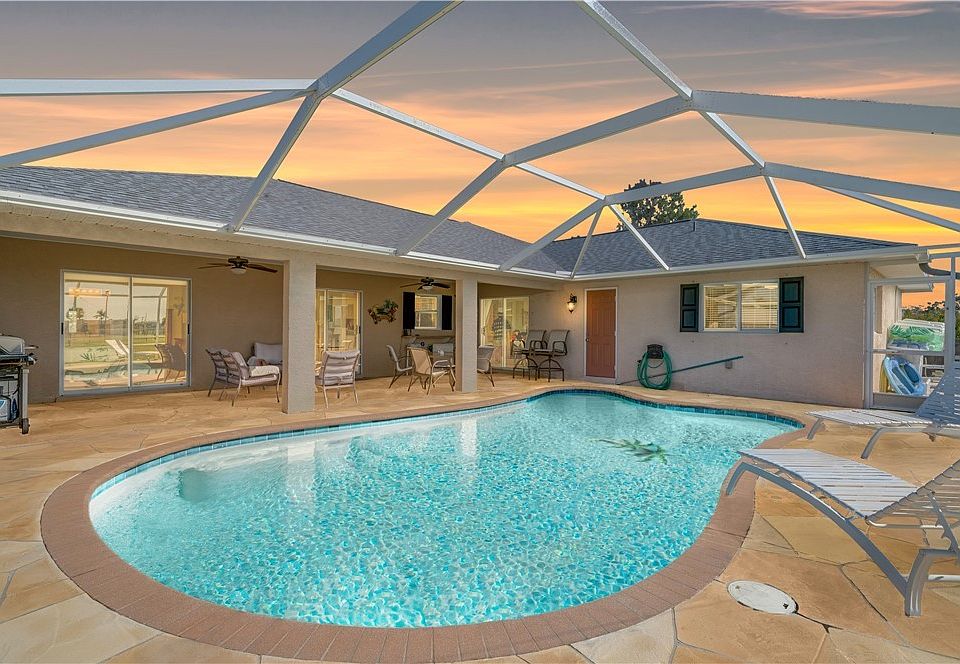 Step into luxury living with this exquisite three-bedroom, two-bath pool home nestled in the serene Southwest Cape Coral neighborhood. Boasting over 2000 square feet of living space, this residence welcomes you with its expansive living and dining area, adorned with volume ceilings for an airy ambiance and a ton of natural light. Entertain guests effortlessly in the spacious kitchen, complete with a breakfast bar and formal dining area. All new GE stainless and black appliances.The split bedroom floor plan ensures privacy, with a generously sized master bedroom featuring its own entry onto the lanai. Updates abound, including a new roof in 2023, A/C 2019 hot water tank 2020 Pool heater 5 years. A large laundry room with pantry and utility tub for added convenience. Outside, enjoy the heated pool surrounded by landscaping, all safeguarded by manual hurricane shutters for peace of mind. Don't miss the opportunity to call this meticulously maintained property your new home. $5,000 seller credit for flooring. 1 year American Home Shield - Shield Plus transfered to buyers at closing paid by sellers with a full price offer.
