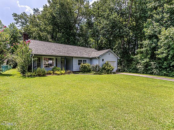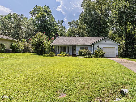 Welcome home to this very well maintained 1 story 3 bedroom 2 full bath home with 1 car garage situated in a cul-de-sac. 2022 roof with hurricane fortified shingles. Covered front porch and large backyard with oversized wooden deck overlooking the peaceful/private backyard. Too many flowering plants and bushes to name them all - they are so beautiful when they bloom! Tiled flooring in kitchen and dining area, carpet in living area and primary bedroom, other 2 bedrooms and hallway have laminate flooring. Living room with trey ceiling and fireplace. Super cute kitchen has a separate pantry and peekaboo area with overlapping countertop perfect for bar stools. Dual vanities in the primary bathroom and a large walk-in closet. Not in a flood zone and the property has great drainage both in front/backyard!! Super close to MCAS and other bases, shopping, local amenities and 30 minutes to area beaches. No HOA, no city taxes and easy to make appointments.