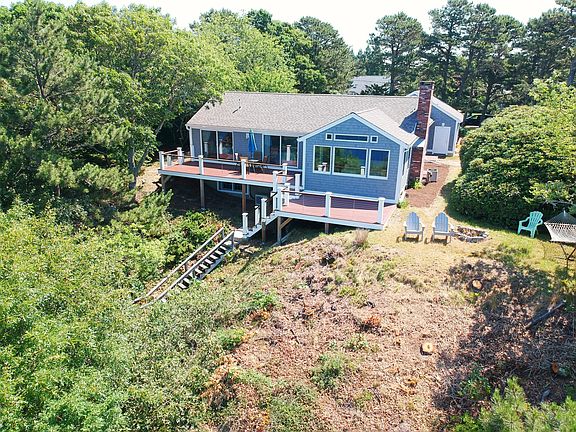 Sheep Pond Waterfront. This renovated, perfectly sited home captures the stunning beauty of Sheep Pond from nearly every room plus the multi-tiered composite decks. Breathtaking views to the south and west provide sunsets, moonrises and an uninterrupted vantage of one of Cape Cod's cleanest and most desirable bodies of water. Swim or paddle from your private stairs and deck platform at water's edge or set up for the day at the association sandy beach around the corner. This light, open year-round beach house is in excellent care. The great room with cathedral ceilings and arresting views is anchored by a new custom Lewis and Weldon kitchen with Thermador and Wolf appliances. Additional first floor rooms include a family room, three bedrooms and two full baths featuring an en-suite primary bedroom with deck access and deep views. Hardwood floors, v-groove ceilings, central ac and vac, gas heat, 2 car garage, numerous upgrades inside and out. The finished walkout level includes a 4th BR, family room and full bath. This property presents a rare opportunity to enjoy nature's beauty firsthand in an amazing setting yet close to all of Brewster's amenities.