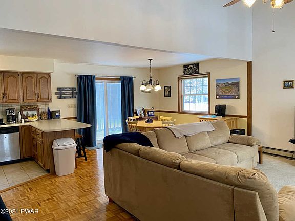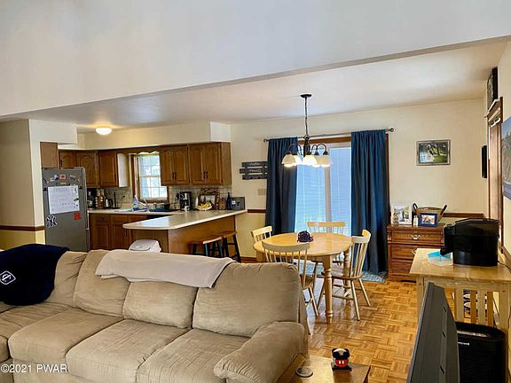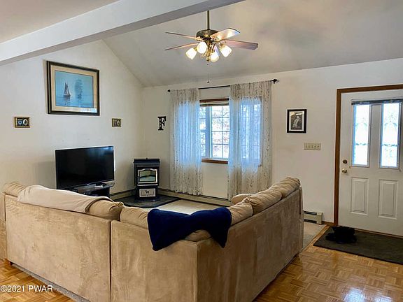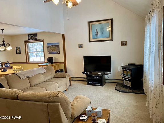 Meticulously kept Salt Box Home built in 1989 features: 4 bedrooms, 2 full baths. Open floor plan in Living Room & Dining Room with Cathedral Ceilings. 1st floor includes: Living Room, Dining room with sliding glass doors that open to a double deck, kitchen, Full Bath with Jetted Tub, Extra bedroom that can be used family room or office. Second Floor: 3 bedrooms and 1 full bath. Basement: Partially finished and includes stainless steel Samsung Washer and Dryer. 1 Car Garage & Paved Drive Way. Many upgrades include newer windows, roof, sliding doors, furnace, water heater, Elec. Box for Generator & septic system and brand new carpets for all bedrooms. Beautiful big backyard and front yard with shed. Conveniently Located with easy access to I-84 & the Dingman's Bridge, 15 min from NJ! near Walmart, Home Depot, Price Chopper, and many stores! Minutes from George Child's Park and Dingman Falls tourist areas!