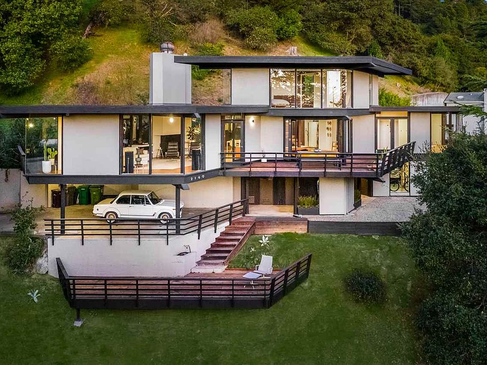 TRANSPARENT PRICING. Ultra-rare Mid-Century masterpiece; the pinnacle of design, lifestyle, & location. Built in 1961 & designed by architect, Benjamin Fishstein, this one-of-a-kind trophy property offers sophisticated distinction inside & out. Nestled amongst tranquil hillside, the home spans over a graceful 2500 sqft featuring 4 bd 3 ba, exposed structural beams, floor-to-ceiling glass walls, wrap-around deck with serene views, & much more. Included on the ground floor is a large en suite in-law apartment with separate entry, two bedrooms on the main level, and an ultimate master bedroom suite/retreat on the top floor. This marvelous architectural gem ingeniously doubles as both a private sanctuary and entertainer's dream with amazing indoor/outdoor flow. Montclair village, hiking, hwy 24 & 13 all nearby!