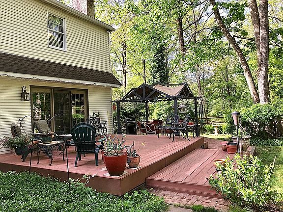 center hall colonial, on cul-de-sac, property backs up to woodlands. has a large second floor gameroom/entertainment room with 16'ceilings overlooking wooded back yard. Glass enclosed back porch with skylights, an attached potting shed. Composite deck and brick patio . Home has hardwood floors, ceramic bathrooms, foyer and kitchen staircases, library with cherry casework and french doors. large laundry with cabinets and closet. 4 large bedrooms. unfinished basement with high ceilings and bilco egress to side yard.