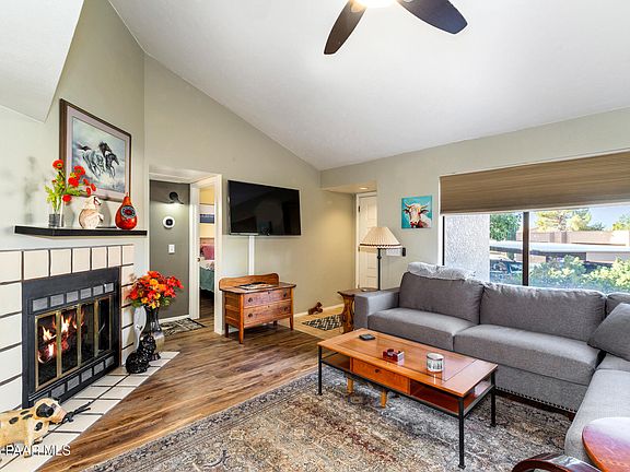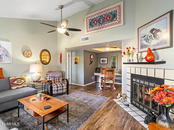 Granite Mountain views from the living room are the first of many great ammenities of this very nice 2 bedroom end unit home. Take a look at this upgraded, extremely clean and well maintained home that shows the pride of ownership. This split 2 bedroom 2 bathroom unit features new exterior paint in 2024, vaulted ceilings, laminate and tile floors and living room gas fireplace with new logs in 2021. Kitchen features new refrigerator, electric range and microwave in 2020, new quartz countertops in kitchen and both bathrooms in 2021, new garbage disposal in 2022 and a new dishwasher in 2023. New ceiling fans were installed in master bedroom in 2023 and over dining table in 2020. Living room window has automatic exterior sun screen with remote control that was installed in 2022.