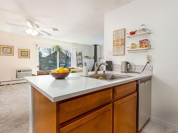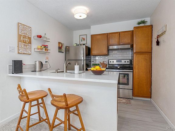 Beautiful and affordable top floor condo! This charming 1 bedroom, 1 bath residence offers a perfect blend of comfort and convenience. With its sleek white quartz counters, luxurious LVT wood inspired flooring, an updated bathroom and a cozy fireplace in the living room, this home exudes modern elegance at a very affordable price. Step onto the balcony deck and be greeted by an interior greenbelt area within the complex right outside your door. Conveniently located with plenty of shopping and restaurants, and with nearby light rail and highway access commuting will be a breeze. Storage closet in basement laundry. Don’t miss this opportunity to own at or below rental options for similar type properties - schedule your showing today. 100% Financing and/or $5K closing cost credit programs may be available on this property-contact Jennifer Langley at KeyBank 303-999-9650.