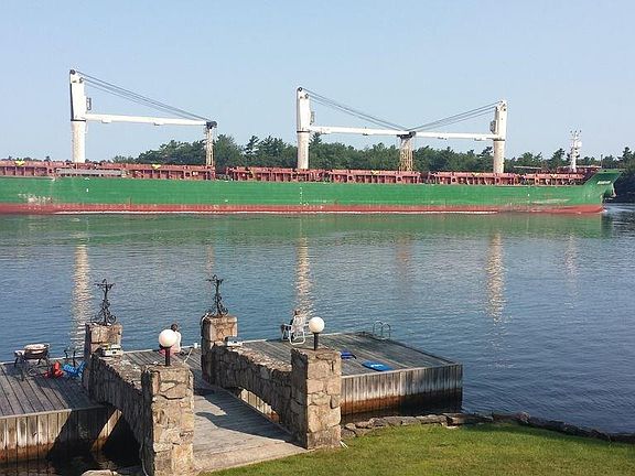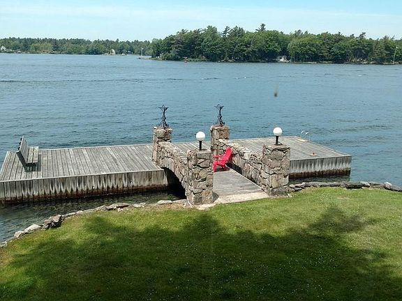 PREMIER: St. Lawrence River/1000 Islands waterfront property situated on a prime point of land directly on the shipping seaway along the American Narrows. One of the most beautiful water passages in the world & choice locations on the mainland between Alexandria Bay and Thousand Island Bridge. This very unique parcel offers granite outcroppings and stonework all around from years past and includes its own island W/ a foot bridge, stone arched patio next to water's edge, massive 60 ft. front dock (ideal for swimming, fishing or just relaxing), sheltered 25 ft. dock for smaller boats & jet skis. The chalet style cedar cottage(3BR/1.5BA) offers a glass porch, newer renovated kitchen, newer thermopane windows, large living rm, master BR W/ 1/2 bath, stack washer/dryer. This property is sold fully furnished & equipped! Offers an outstanding rental history of $ 3,000/wk on VRBO. ONE OF THE BEST!