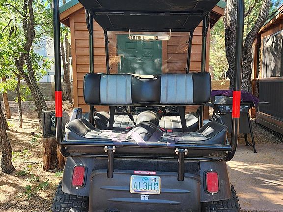 Perfect location, Come and see this charming cabin nestled among the majestic tall pines on one of the largest lots in Vacation Village with a circular drive, enough room for 2 cars and the golf cart. Just imagine tooling around with friends in the 4 seater golf cart (that is in excellent condition), then come back and enjoy the clean mountain air while eating and relaxing on the enclosed deck with plenty of seating. This adorable and well maintained home comes completely furnished, storage shed, 3 TV's, Pots & Pans, yard tools, washer, dryer and freezer and the golf cart. This home is a lock and leave setup with a heat trace for the water lines. No extra work to winterize! Come see this retreat today and make it yours!