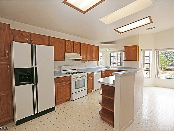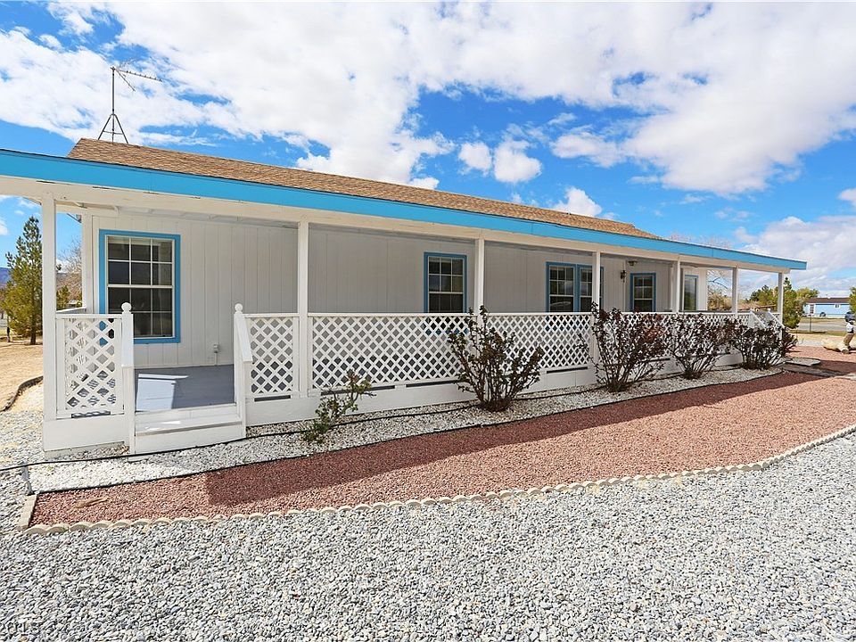 Cozy Ranch style home with 3 bedrooms 2 baths and 2 car oversized Garage (room for a workshop area). Front (full length) porch with great view of Mt. Charleston. Property is fully fenced and cross fenced. Full RV hookup and dump station. Spacious kitchen with skylight. Master bedroom with walk-in closet and Master bath with jetted tub. 2nd bath has skylight. This is truly MOVE-IN ready. At this price this house will not last.