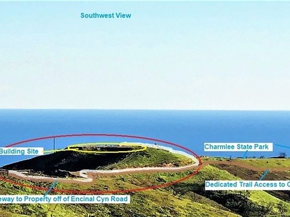 Breathtaking Sunrise to Sunset Views over the Malibu Hills and Ocean. 7 Malibu Acres with Approved Graded Huge Flat Building Pad .Vested Coastal Approval for a one story home - see photo section for famous redesigned house plans by well known local architect Doug Burdge. Large Building Pad has already been graded and permitted with dirt road to property from Encinal Canyon Road. By far the best large Estate site available in Malibu at this time . Available: Schmitz Expediter's package with Plans, Geology/Soil Reports , Septic Tests and plan, grading and drainage plan, Site Survey . Only a few minutes to the beach - direct horse and hiking trails to Charmlee State Park. Rare and Special Property and by far the Best Land Buy in Malibu priced under $1m!