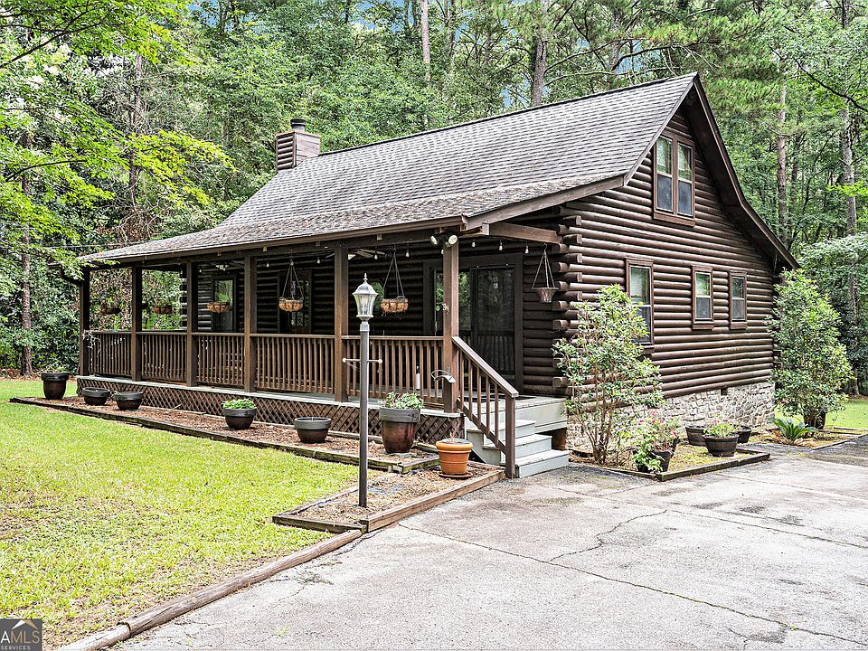 Charming log cabin nestled on a private 2.57-acre wooded lot in Conyers! This beautifully maintained 2BR/2BA home features a fresh-stained exterior, a newer roof (2022), and a cozy front porch perfect for relaxing. Step inside to vaulted ceilings with exposed beams, skylights, and a stone fireplace that anchors the living space. The bright sunroom offers flexibility as a home office, workout space, or potential 3rd bedroom. Enjoy a functional kitchen with all appliances included, along with a separate laundry room featuring washer and dryer. A detached 2-car garage provides extra storage and workshop potential. Enjoy the quiet of country living while being just minutes from shopping, dining, and I-20 access. Move-in ready with timeless rustic appeal don't miss this unique opportunity!