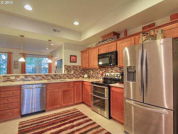 Gorgeous Townhouse backing to greenspace!Open floor plan boasting 9ft ceilings on Main.Recent $10k gourmet kitchen remodel,new Silestone countertops,backsplash & SS appliances.The home has a new water htr along with new carpet, interior paint.Views of Orchard Park from living-rm & master suite which has 20-Acres of wooded area/walking trails.Walk to Max,Whole Foods & Streets of Tanasbourne!Close to Intel,Nike,& other hi-tech companies.