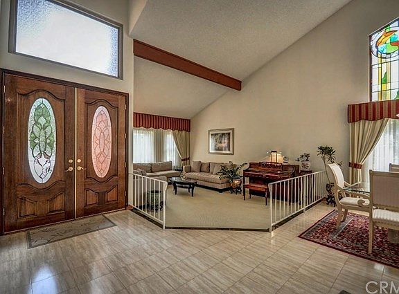 Beautiful Coyote Hills home with an excellent location and wide open floor plan. This home has great curb appeal with a lovely covered entryway with double door entry and extra large windows. The front doors swing open to a formal entry which leads to a spacious formal living room with natural lighting, vaulted ceilings, and exposed beams. Just off the living room, the formal dining room features tile floors, and a large stunning stained glass window. Your kitchen is complete with granite countertops (and matching backsplash), custom cabinetry, a recessed ceiling, separate dining area and garden window with backyard views. The family room has multiple oversized windows, wet bar, custom stacked stone fireplace, hardwood floors, and a large sliding glass door to the backyard. The peaceful backyard setting has an expansive tile patio, lush greens providing privacy, and is absolutely perfect for entertaining. Back inside you will find spacious bedrooms upstairs, a large guest room connected to the family room, master suite with tons of storage, and a master bath with dual sinks and separate bath/shower. The large bedroom just above the garage can easily be a second master bedroom and has a gorgeous, oversized stained glass window. Make this home yours today!