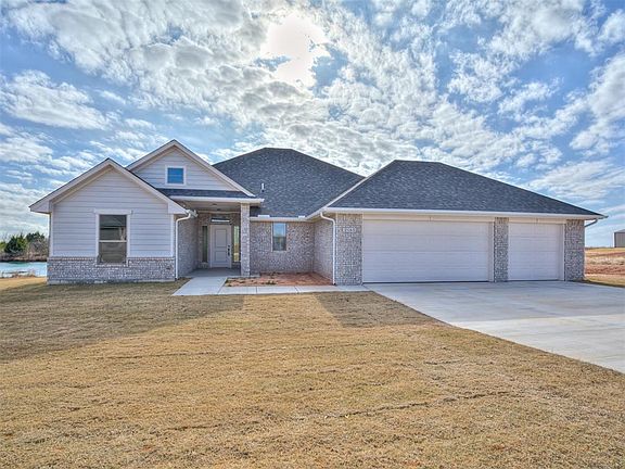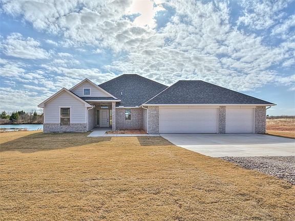 BACK ON MARKET- No fault of seller. So much to offer on this new home! $5000 BUILDER INCENTIVE AVAILABLE. SHOP INCLUDED! Let's start with the huge 2.58 acre lot that features a seasonal pond! This flexible plan features 2 bedroom suites! The owners suite features a spacious bathroom with dual vanities and a separate tub and shower...plus a huge walk in closet! Second bedroom suite has its own private bathroom. Bedrooms 3 and 4 are nice sized and share the homes 3rd bath. Everyone hangs out together in the open living/dining/kitchen area. Kitchen has tons of counter space, stainless appliances, and a walk in pantry. Oversized utility room with room for freezer or hobby area. Covered patio for those Oklahoma sunsets. And, 30*40*10 SHOP with concrete floors INCLUDED! NOW WITH STORM SHELTER and garage door openers!