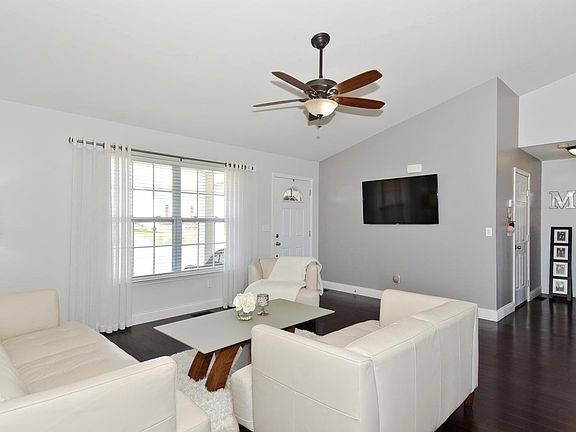 This newer (built in '09) ranch home with a partial brick front features new dark hardwood floors throughout, an open layout with vaulted ceiling in the living area, breakfast room & kitchen; walkout basement, & beautiful wooded view from nice large refinished deck. It has an open staircase with custom black iron balusters/spindles; stamped concrete driveway, front porch, sidewalk & large custom stamped concrete patio. Kitchen features dark wood cabinets new Samsung stainless appliances, built-in microwave, custom tile backsplash, pendant lights, & pantry. Master bedroom suite features double sink, separate shower & tub, & walk-in closet. Basement has 8 ft pour, rough-in for bath, & space for work-out room (or possible 4th bed) with window. Other features include: vinyl insulated windows, oversize drywalled garage, security system, crown molding, ceiling fans, custom window treatments, 30 yr arch shingles, sliding glass door, panel doors, covered porch, & 6.5 inch baseboards.