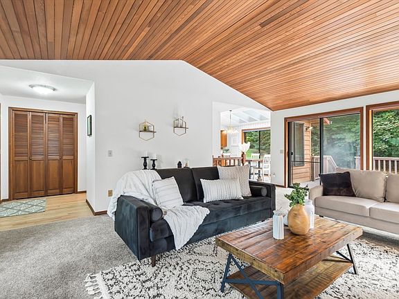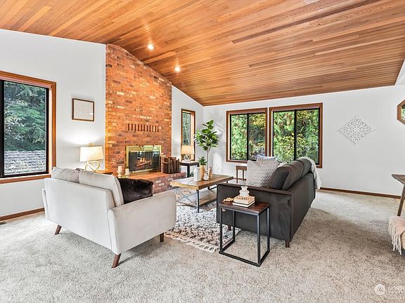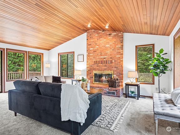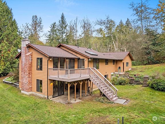 First time on market! Custom home on 5+ Acres – Ready for Your Updates! This home sits at the end of the road on 5+ acres of pristine privacy. Upon entering, you are greeted by hardwood entry, soaring cedar ceilings & beautiful brick fireplace in the light & bright living room, w/new carpet & slider to the expansive, new deck. Generous dining room w/skylights, + a huge kitchen with ample oak cabinetry for storage. Main floor primary boasts WIC & en-suite bath. Utility room & 1/2 bath round out the main floor. Downstairs family room has a wood stove, 2 more bdrms, 3/4 bath & huge storeroom. AMAZING 2,700 sq ft shop has a loft/potential DADU. Shop has 2 RV doors, 2 vehicle doors, grease pit, winch, compressed air thru-out & compressor!
