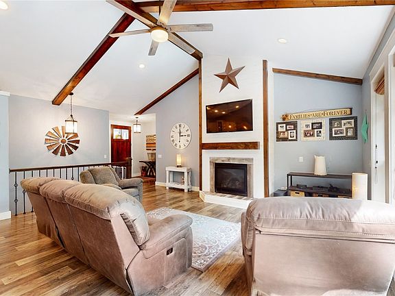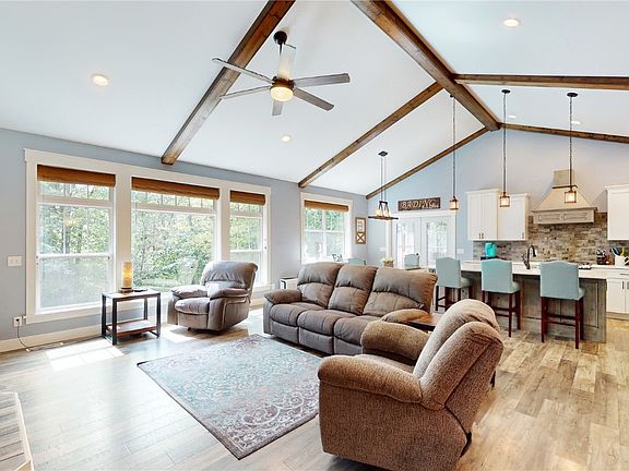 Over an acre of wooded bliss ready to welcome you home! This custom built home has left nothing out when it comes to charm and amenities! The front door begins to tell the story with solid wood entry, class and style! Enter into the great room and vaulted beamed ceiling, fireplace and open concept kitchen/ dining room, solid plank flooring and quartz countertops! Open the double doors to the screened porch with beautiful views of the wooded yard and fenced area for you needs! Rounding out the first floor is the primary sweet and secondary bedroom as well as drop zone and laundry, just stunning! The lower level offers a large rec room, 2 more bedrooms and beautiful bath! All on a private access road for the neighborhood! Don't miss this opportunity!