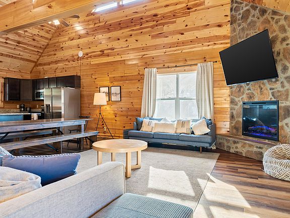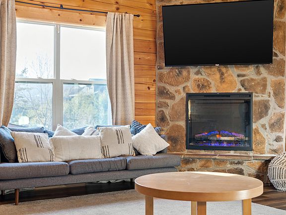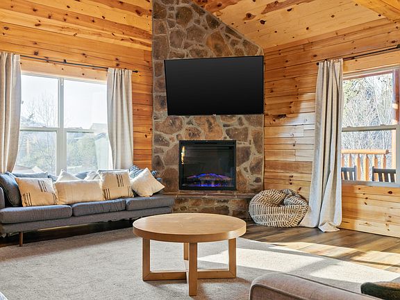 Throughout the home, you will enjoy upscale furnishings, beautiful mountain themed framed prints/decor, and custom curtains and finishes. Outside, multiple extended height porches provide the perfect place to take in the views of Bluff Mountain. The lower level offers an extra-large theatre & game room as well as a bedroom and private bath. The resort offers indoor/outdoor pools, waterfall, clubhouse, private mini golf area, wrought iron security gated entries, and easy roads. Actively on a STR program, it will be sold fully furnished with an acceptable offer. Whether you are looking for a personal retreat in the mountains or a lucrative addition to your vacation rental portfolio, this beauty presents the perfect opportunity for you. In 2023, this home grossed just over $131,000 in income. All information is deemed reliable, but not guaranteed. Buyer to verify all pertinent information.