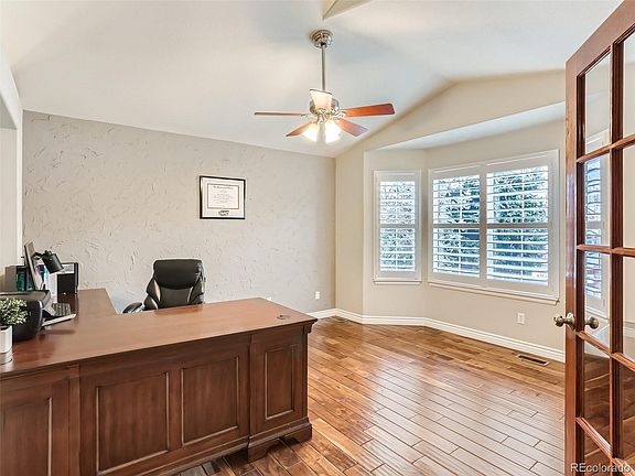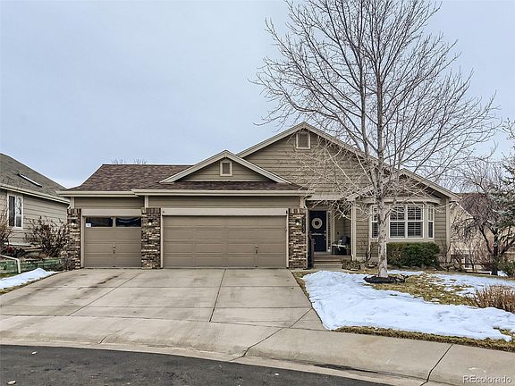 Beautiful, meticulously maintained 5 bedroom, 3 bathroom home in the wonderful and coveted town of Castle Rock! Located at the end of a cul-de-sac in the community of the award winning Red Hawk Ridge Golf Course. This home is light, bright with an open floor plan. When entering you will notice the stunning upgraded wood floors throughout most of the main level along with tall ceilings and plantation shutters. The study is located up front with a bay window and french doors. The large dining room allows for extra leaves to be installed in your table when needed. The kitchen boasts newer, higher end stainless steel appliances along with cherry cabinets and pantry. The kitchen also has an awesome moveable island with seating. The family room has surround sound installed and a tiled gas fireplace. The primary bedroom features a corner rock gas fireplace and is connected to a great 5 piece master bath with 18" tile floors and a walk-in closet. There are two other secondary bedrooms on the main level with a secondary bath that has dual sinks. As you go down to the walk out basement you will notice the attractive wrought iron open railed staircase and the newer carpet with upgraded pad. The family room is huge, featuring pre-wire for surround sound and enough space for a gaming table. The laundry room is a mom's dream. Gigantic, with utility sink and enough area to be shared as a craft room. Charming wine room. Exercise room with mirrors and TV. Two more large bedrooms and a gorgeous tiled bathroom. The backyard is great for entertaining. It has a large trex deck and a patio area below that features a newer hot tub, large yard with beautiful mature landscaping. It also has an invisible fence installed for your pets. With this home facing west, you will be able to enjoy the summer afternoons in the shade of the home. You get views of the "ROCK" from the deck, quick access to I-25, parks, trails, schools and shopping. New furnace & A/C in the past 2 years! VERY LOW TAXES!