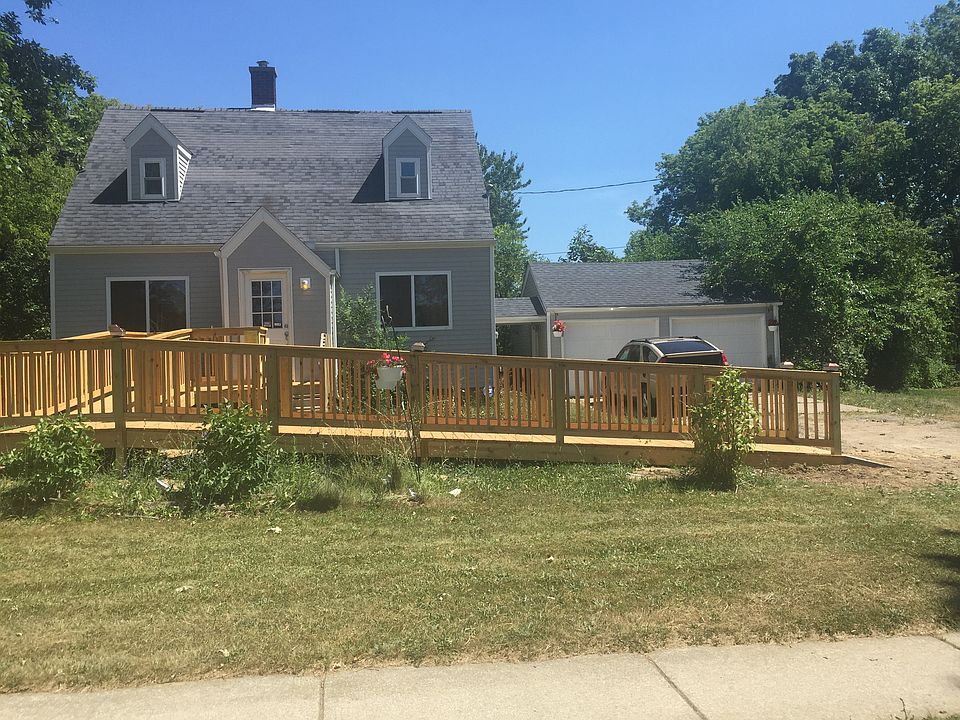1.5 story with one bedroom down and 2 bedrooms up, full basement, with handicap ramp in front.