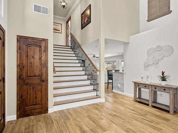 Spectacular whole house remodel. Must see to truly appreciate the hardscape improvements, superb craftsmanship, modern upgrades & architectural nuances that deliver character & charm throughout. Chefs dream kitchen includes six burner stove, granite countertops, abundant custom cabinetry with under cabinet lighting. Porcelain woodgrain tile throughout downstairs, white oak solid wood stairs welcome you to second story where vinyl plank flooring greet your feet. Knotty Alder interior doors, LED recessed lighting, automatic window shade control, all lighting fixtures tied to dimmer switches and bullnosed cornering lend a touch of class & modernity. Huge master bath features soaker tub, separate custom shower & dual sinks. Don't miss balcony sitting area off bedroom. Hardscape improvements include new stucco, vinyl windows & doors, concrete tile roofing with 50yr. paper warranty, new copper plumbing rerouted through walls, installed & PAID FOR 12 panel solar system & new concrete walkway in front yard. Full A/C system & Ceiling Fans. Deep & generous 28x23 three car garage easily holds todays larger trucks & vehicles. Tastefully landscaped, backyard boasts covered patios, fire pit gathering area & plenty of room to roam for pets & kids. Cul-de-sac setting with Woodhaven park a short stroll away. Five minutes to shopping malls, restaurants, freeway access & Cuyamaca CC. Rancho San Diego is an outdoorsman paradise with plenty of golf courses, hiking, biking & horse trails nearby. Conveniently located to East county lakes, campgrounds & casinos. A special turn key home.