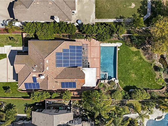 VIEW AND POOL! Take me away! Nestled in the serene hills of Reche Canyon, just minutes from Loma Linda, this exceptional home offers the tranquility of a private oasis with scenic canyon and mountain views, and city lights twinkling in the distance. Attractive landscaping surrounds the property with a backyard designed for both relaxation and entertainment. Enjoy the shaded patio or a dip in the cool blue pool or spa. The built-in barbecue for outdoor dining completes the resort-style ambiance, all complemented by mature fruit trees and flowering plants. A grand, columned entrance opens to a formal foyer and spacious, light-filled living room featuring volume ceilings and refined architectural detail. The formal dining room is ideal for entertaining guests or hosting special occasions. At the heart of the home lies a beautifully remodeled, gourmet kitchen—an epicurean delight—complete with extensive cabinetry, a built-in task desk, stainless appliances including a double oven, and a massive island with breakfast bar seating. The kitchen opens to a cozy family room with an inviting fireplace. This thoughtfully designed home also features a convenient downstairs bedroom with its own ensuite bathroom—ideal for guests, extended family, or multigenerational living. Offering comfort and privacy, it’s a perfect retreat with easy access to the main living areas. Upstairs, the luxurious master ensuite serves as a relaxing sanctuary with amazing views.The remodeled bathroom offers spa-like comfort with dual vanities, an oversized walk-in shower, a classic oval soaking tub, and a generous walk-in closet. A generous upstairs loft adds versatile living space, perfect for use as a second family room, home theater, game room, or home office. The third and fourth well-sized bedrooms offer comfortable accommodations and share a conveniently located hall bathroom with a dual-sink vanity. A remodeled laundry room offers practicality with a utility sink, ample counter space generous cabinetry for storage. And that’s not all, the home also features a spacious three-car garage, offering ample space for vehicles, workspace, and storage. AND THE FULLY PAID-OFF solar system provides impressive energy savings, making a significant impact on those utility costs. Located in a tranquil neighborhood, with easy access to the hiking and bike trails of nearby Bue Mountain, and yet conveniently close to freeways and everyday amenities, the perfect balance. . . this home is a must-see!