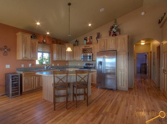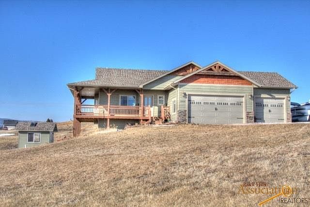 This is a quality custom built Kaski home with a 90% efficient furnace, 40 year shingles and 2x6 construction Ranch Style on 3 acres. The wrap around porch is an ideal place to take in the panoramic views of the Black Hills. On the main floor some features include a completely open concept, Lennox gas fireplace, hardwood floors, and a master suite with a Jacuzzi tub and double sinks - additional bedroom and full bath on the main floor. The lower level offers 10??? ceilings surround sound, walk out basement opens up to concrete patio area and allows access to the separate hot tub room, 2 additional bedrooms down and a full bath. Last but not least enjoy the 3 car garage and extra room for all of your toys! Located in a private neighborhood just 20 minutes from Rapid City.