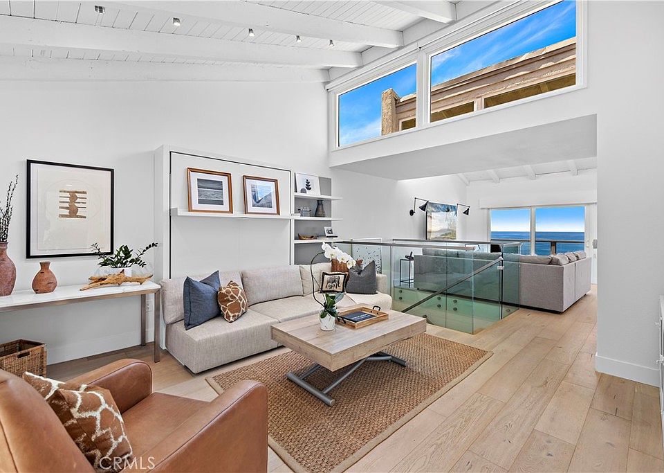 This stunning condominium offers unobstructed breathtaking ocean views from almost every room. Fully remodeled with spacious living areas, vaulted ceilings, white oak plank floors, glass handrails, and luxurious finishes, you'll feel like you're living in a high-end resort. The open-concept living room features a recessed fireplace and sliding doors that open to beautiful ocean vistas from the front deck, and to the partially shaded rear patio. This seamless indoor outdoor living is perfect for entertaining, soaking up the sun, or relaxing in the shade. The open gourmet kitchen includes an 8' Quartz waterfall island and premium stainless steel appliances, including a Wolf 6-burner range, inviting you to cook up a storm while visiting with your guests. Unwind in the generous primary suite with its private balcony, where you can enjoy your morning coffee surrounded by the ocean and lush landscapes. The second bedroom also boasts spectacular views and is perfect for guests or as a home office. Located in Aliso Laguna a desirable community with an elevator and pool, you'll enjoy privacy and exclusivity. And with its convenient location just steps from the beach, Montage Resort, shopping and dining, you can enjoy everything that coastal living has to offer. This home also features central AC, and a gated garage plus overflow parking. Welcome to paradise with ocean views!