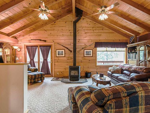 Charming rustic cabin sitting on 6.98 acres! The 960 sq. ft. pole building shop gives you space for a workshop or to store all your outdoor toys! The main level features an open layout with beautiful wood vaulted ceilings, a warm pellet stove in the living room and spacious kitchen featuring a center island and tons of cabinetry space, the large deck that wraps around the entire back of the home where you can enjoy the views of the hills! The walkout basement offers a 2nd bedroom, full bathroom and large family room with another cozy pellet stove and a separate library space lined with book shelves! You will love the outdoor hot tub just off the backyard patio! Don't miss your chance to see this home!