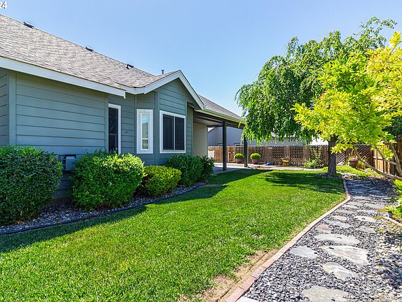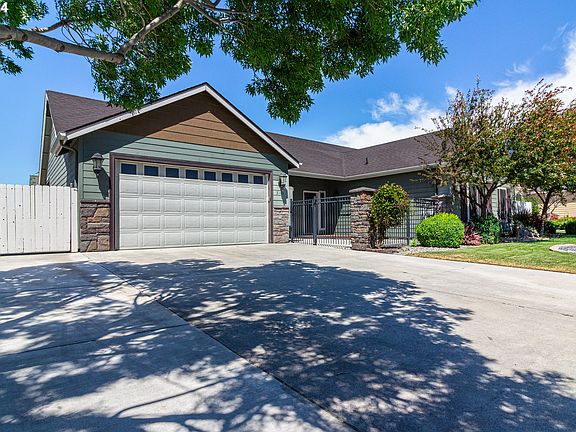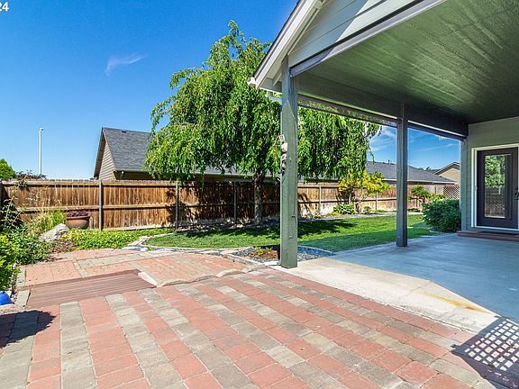 Beautiful 3 bedroom 2 bath home. Some of the amenities include gas fireplace, Kinetco water Softener, Solar Screens, Hunter-Douglas Duette window blinds and verticals, beautiful tile floors. Home features a wonderful kitchen with solid wood cabinetry, primary bedroom suite features double sinks, walk-in shower, garden tub, closet with fabulous built-in closet pack. The dining room opens to a lovely covered back patio area with pull down solar screens so you can enjoy the evening air. Fully landscaped with cedar fence and patios both front and back. Oversized garage and generous extra concrete parking slab in extending behind the backyard gate. All of this in one of Hermiston's finest subdivisions. Contact your favorite agent to view this home today.
