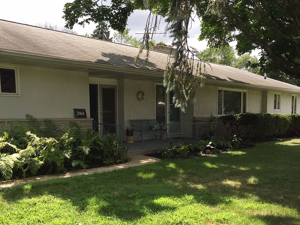 This mid-century modern ranch home on a double lot has an open floor plan with several recent updates. It is in a great location close to library, grocery, restaurants, parks, and schools. When you buy this house, you can move in immediately. It features: Large lot: 110 ft. x 160 ft. or .404 acres 2 large bedrooms with refinished hardwood floors 2 full baths, 1st floor one has new tile floor, toilet and sink Lots of storage space Remodeled kitchen with new cabinets, new floor, new dish washer, and new butcher block counter top Large living room with gas fireplace, new engineered flooring Large dining room with new floor Breakfast room with enough space for office 2 car garage with large driveway pad for turn around or to park your boat! Basement has new floor and ceiling on one side and new furnace and water heater on the other Shady front porch Three season room All interior walls newly painted Fenced rear yard with great potential for house addition, garden, deck/patio.
