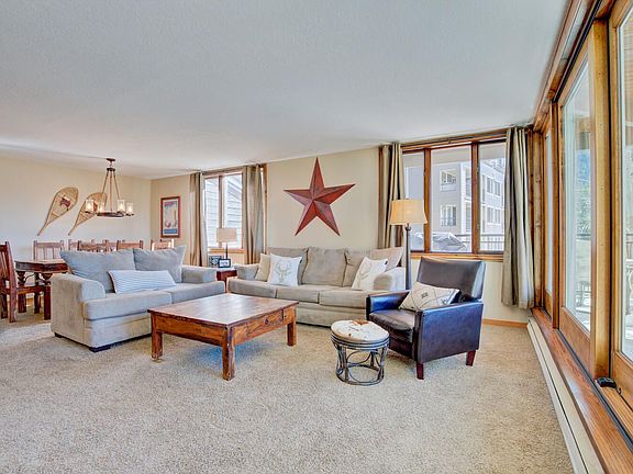 Highly desirable first floor end location with south and west exposure. Large covered wrap-around deck overlooking the Pines meadow and River Course to snow-capped peaks. Spectacular sunsets! Remodeled with granite tile, stainless appliances, solid alder doors and trim, new bath tile and lighting. Best indoor pool facility in Keystone! Large south-facing sun deck off pool building with outdoor common BBQ grill. Pet friendly for owners only. No transfer assessment. Shuttle to ski base.