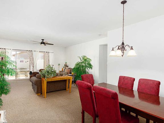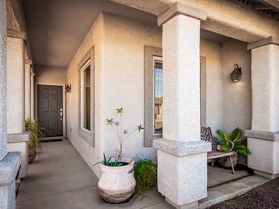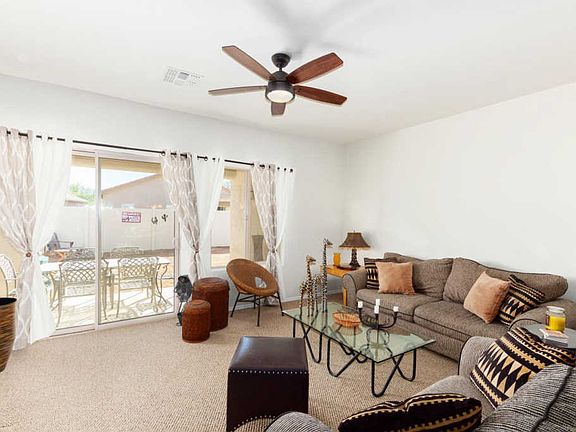 Beautiful single level home w/a charming front porch entry & 2 car garage. Spacious great room floor plan w/plush carpet, crisp palette, formal dining area, ceiling fans, & patio access from entertaining area. Stylish kitchen counters, pantry, bright breakfast area, & plenty of wood cabinets. Create a feast with family & friends. 4 Bedrooms, ample closets, 2 baths, & interior laundry room. Master retreat w/a private en suite, dual sinks, & window blinds. Backyard w/a covered patio is waiting for your dream desert oasis! Take a tour today & stop renting!!