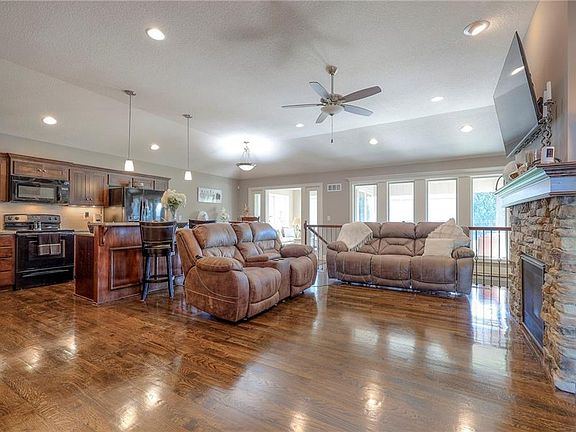 Highly sought-after Ashton Reverse 1.5 Story with 2 beds up and 2 down. Open main floor features custom kitchen cabinets, walk-in pantry, laundry, and a stacked-stone fireplace. Primary suite offers dual vanities and a large walk-in shower. Enjoy a sunroom that steps down to a covered patio, with a bonus room below perfect for a gym or office. Finished basement includes two beds, full bath, cozy fireplace, and great storage. Located on a spacious corner lot with full metal fencing, fresh landscaping and sprinkler system. Move-in ready!