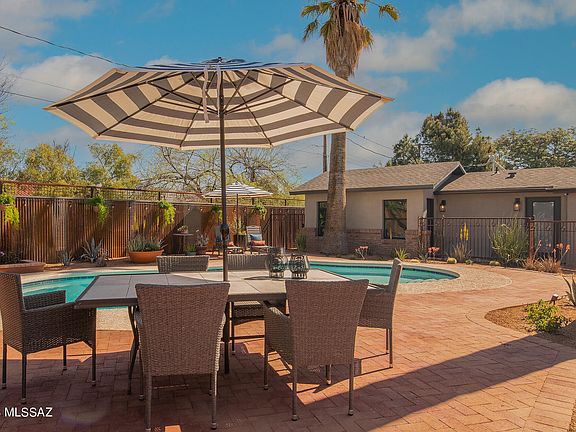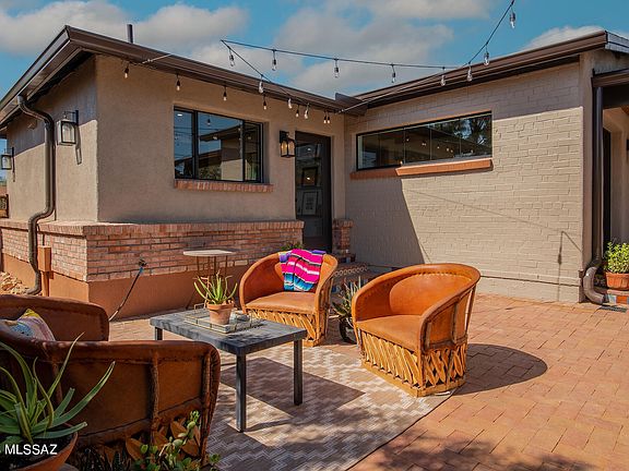 After a meticulous restoration, this bungalow in the Historic Catalina Vista neighborhood is replete with custom craftsmanship. Updated and expanded for modern living, the house has all new plumbing, electrical, windows, roofing, and fixtures throughout. The captivating main home and guest house are fitted with locally made alder cabinetry, beveled quartz countertops, and elegant tile work. Solid hardwood floors, built in niches, and beamed ceilings create warm spaces rich in character. The gracious primary suite has an alcove for reading, ample bathroom with double sinks, private toilet, linen closet, and door to the patio. A split floor plan leads to two additional bedrooms and delightful laundry room with sink and generous storage. (Owner/Agent) Natural light teems from abundant windows which overlook the manicured landscape and sparkling pool. Beyond the expansive brick patio lies the studio guest house with a kitchen and bathroom which has a convenient door to the pool & patio. An additional bonus room is perfect for an artist's studio, gym, or work from home. Just minutes from the Arizona Inn, Banner UMC Hospital, and the University of Arizona.