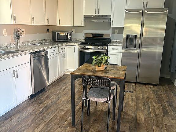 Updated sidingLarge deckTwo spacious closetsKing-size bedDark woodgrain flooringStainless-steel appliances