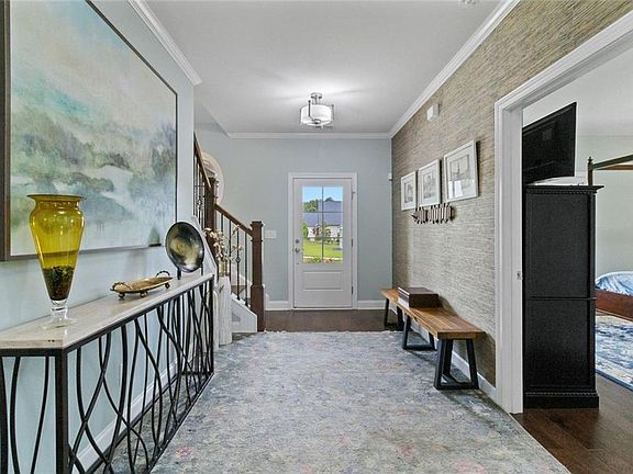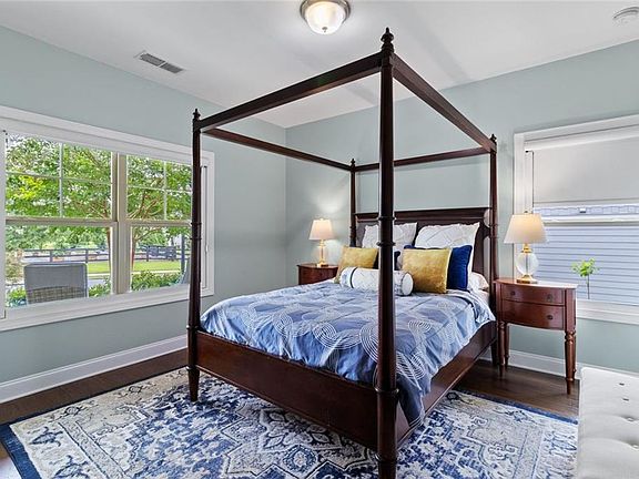 Discover this exceptional custom-built home nestled in the lively and active 55+ community of Nestledown Farm. Designed with delightful surprises, this residence offers a perfect blend of comfort and elegance. Step into the large, inviting foyer that leads to an open floorplan. The spacious living room flows seamlessly into the custom kitchen, featuring quartz countertops, soft-close cabinetry, pot and pan drawers, a stunning custom vent hood, beverage cooler, a huge island and a walk-in pantry. Surrounding the dining area are numerous windows that flood the space with natural light and create a beautiful setting for meals. And just outside the center window, a rain wall is strategically placed, at night the fire table glows behind the water feature, creating a captivating ambiance. Off the living room, a spacious tiled sunroom provides additional comfort and versatility. Beautiful, manufactured hardwood flooring flows throughout the home, adding warmth and style. From the garage, enter into a custom "drop zone" designed for convenience. The primary suite was thoughtfully designed, complete with a custom dressing room, washer and dryer, and an island for folding and storage. The luxurious primary bathroom you'll find quartz countertops that span the double vanity, a large curbless shower, and a Toto bidet in the water closet. You'll also find a private guest bedroom and a full bath on the main level. Upstairs offers a casual living room, two bedrooms, a full bath with a 66" spa tub w/shower, a couple of storage rooms, one with a Versa Lift lowering to the garage floor for easy access. The backyard is an entertainer’s paradise, featuring a pergola-covered grilling area, patio dining, low deck seating area, gas line for a grill and fire table, rain wall, and abundant fruit-bearing trees, including apple, peach, and cherry. The garden is home to raspberry, blackberry, blueberry, and strawberry plants. Nestledown Farm comprises 80 homes with a homeowner's association fee that covers refuse pick-up, lawn mowing, bush trimming, yard insect control, and annual mulch and fertilizer. The community also offers a garden, clubhouse, pool, fitness center, and a variety of events and clubs. Just a short ride by golfcart, bicycle or car, or take a walk to Cumming’s newest gathering place, City Center, to enjoy dining, shopping, and concerts.