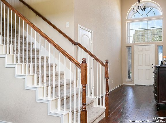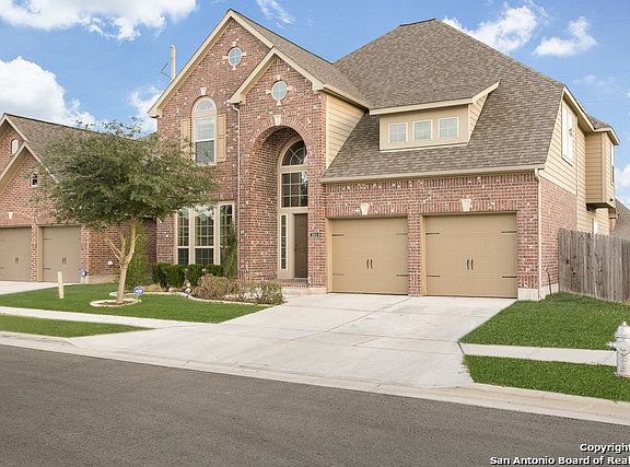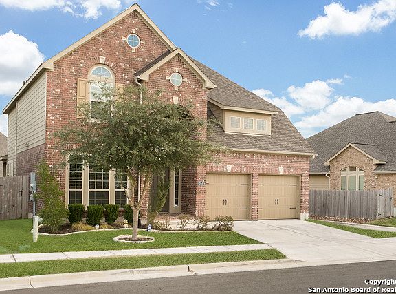 Stunning 4bed/3.5bth! Elegant architecture/beautiful masonry. Entry w/18 ft. ceilings & chandelier leads to open living room/kitchen. Vaulted living feats oversized windows-ample natural light. Kit feats granite, staggered 42" cabinetry, stainless knobs & pulls, 18" ceramic floor/backsplash diamond pattern. Master-lrg windows, full ensuite separate garden tub/shower, & walkin. Lrg secondary bedrooms & loft up. Covered patio, privacy fence. Innovative ISD, close to shops, dining, entertainment, & JBSA Bases!