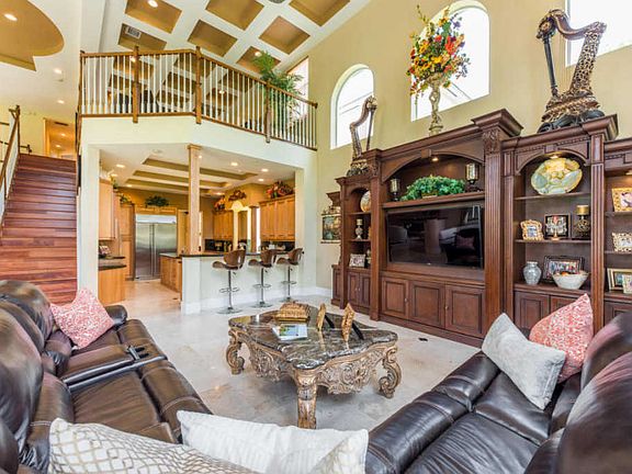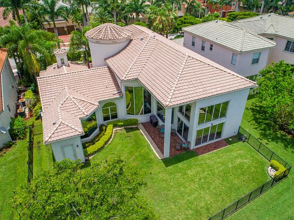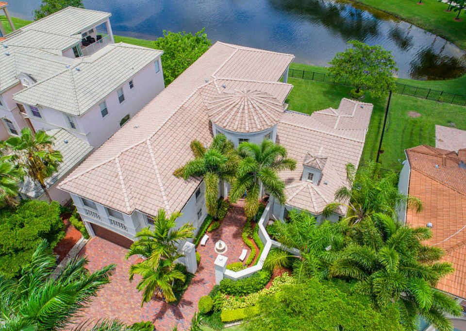 Gorgeous lakefront, estate home offering 5 bedrooms plus a den and expansive loft in Olympia, a resort style community located in Wellington. Step inside through the courtyard entryway and be wowed by a grand foyer, soaring ceilings, marble flooring and spacious living areas with tons of natural light. This home boasts a gorgeous foyer, formal living and dining rooms and an inviting kitchen which offers a great snack bar, beautiful cabinetry, granite counter tops and newer stainless steel appliances including a double wall oven. The vast master suite is downstairs and offers his and her bathrooms and a luxurious spa tub along with 2 walk-in closets. The office and one guest room are also downstairs. Take the grand staircase to the second floor and enjoy a sizeable loft which would make a