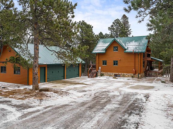 Listed by TJ Wojtanowicz – Black Hills Realty – 605-863-1920. A MUST SEE! This meticulously maintained true log home offers over 2,300 sq. ft. of finished living space on 4 beautiful acres, and is horse-friendly. The open-concept main level features soaring ceilings, a stunning floor-to-ceiling rock fireplace, and expansive windows framing breathtaking views. The kitchen showcases hickory cabinets and hickory floors that flow into a spacious dining area—perfect for gatherings. The main level includes a comfortable guest suite with walk-in closet and a large bathroom featuring a whirlpool tub/shower surrounded by custom rockwork. Upstairs, the master loft suite offers incredible character and privacy, complete with two Juliet balconies, a luxurious bathroom with a two-person whirlpool tub, separate shower, and dual walk-in closets—one already equipped with additional washer/dryer hookups. The lower level includes two bedrooms with backyard access, a family room, full bathroom, laundry room, and utility space. Outside, a generously sized 3-car garage, and a detached shop providing even more storage and workspace. This exceptional property blends rustic charm, modern comfort, and wide-open space—schedule your showing today!