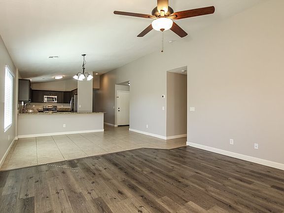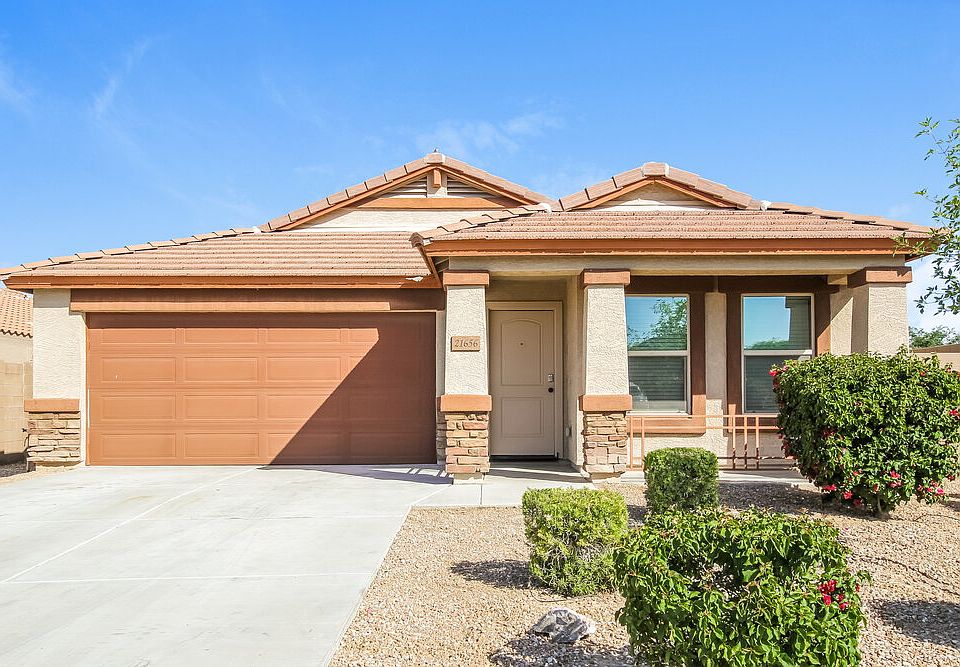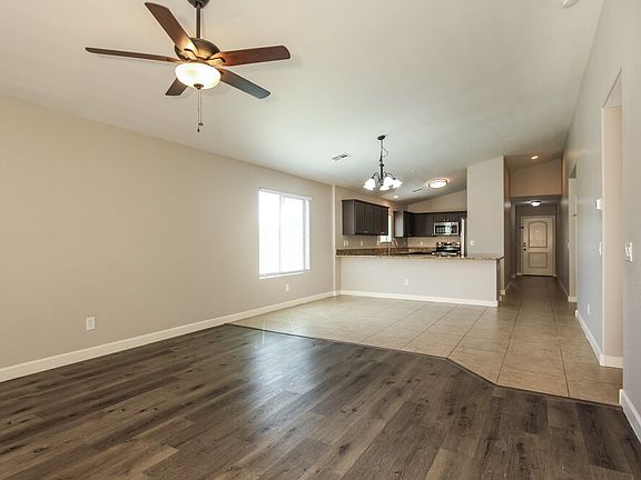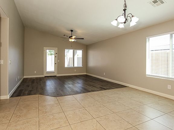 Please note, our homes are available on a first-come, first-serve basis and are not reserved until the lease is signed by all applicants and security deposits are collected. This home features Progress Smart Home - Progress Residential's smart home app, which allows you to control the home securely from any of your devices. Want to tour on your own? Click the "Self Tour" button on this home's RentProgress. This three-bedroom and two-bathroom rental home in Buckeye, AZ has an attached two-car garage and is move-in-ready. The single-story layout includes a bonus room and an enclosed yard with a covered back porch that is perfect for your pets and entertaining. Vinyl plank flooring in the living room lends a modern feel, and the ceiling fan adds comfort year-round. Step into the adjacent kitchen to find granite countertops, stainless steel appliances, and a roomy dining area with a chandelier. An extra-high angular ceiling keeps the main bedroom suite feeling open and airy. The suite comes with two sizable closets plus an en suite bathroom with the luxury of dual vanity sinks. Don't wait to book a tour of this fantastic property!