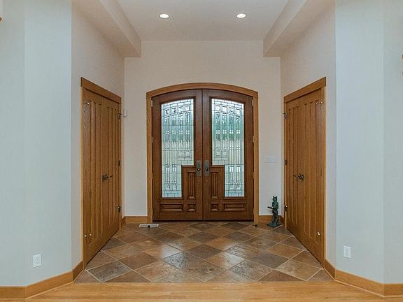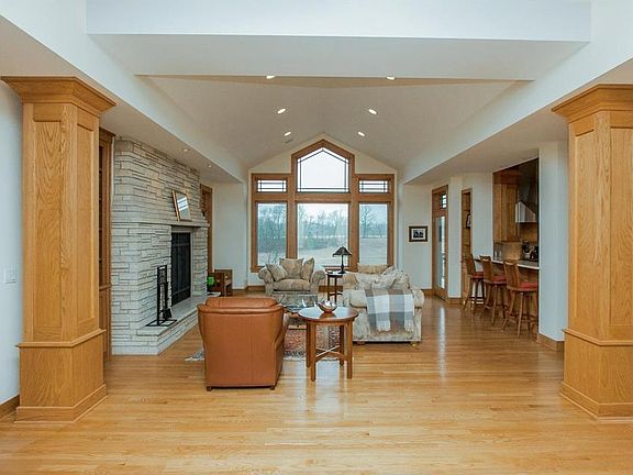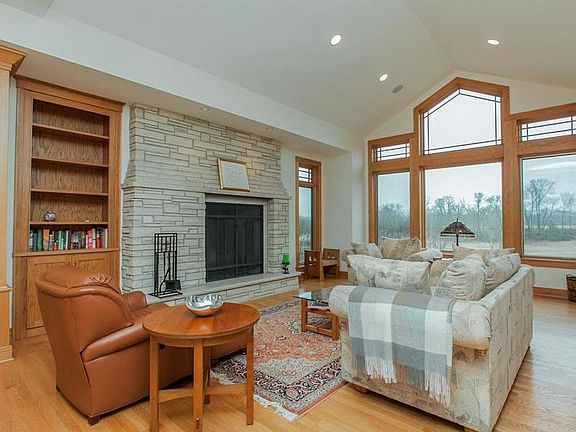Stunning O'Dell built home on 6.7 acres. Rumford fireplaces on each floor, featuring Stone City stone, custom screens, and built-ins. Exquisite details, including a Waterford chandelier that's motorized for easy cleaning; custom wrought iron banister; chef's kitchen with 2 islands, quartz & granite counter tops & cherry cabinets; and formal dining with Frank Lloyd Wright-inspired built-ins. Master suite features his & hers closets, jetted tub and walk-in tiled shower. Lower level offers mother-in-law suite, 2 additional bedrooms, another full bath, plus a theater room. Laundry on each floor. Heated garage with pet wash area and a section of heated floor for kennel space. Irrigation and underground pet fence around front & back of house. Outdoor features include deck off living room and kitchen nook, spacious patio with outdoor fireplace, and a creek running through back of property. Must see to appreciate all of the details.